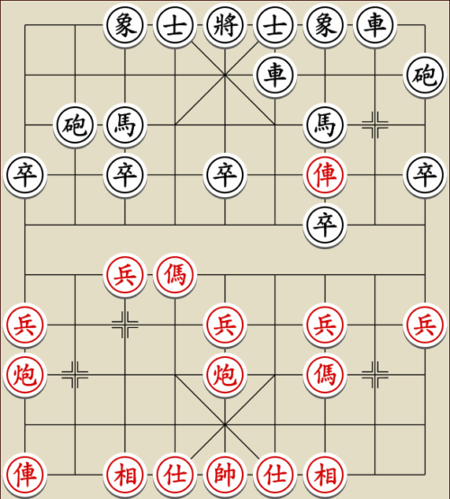 Bis hierher kommt auch mein Eröffnungsbuch. Wenn ich es richtig deute, heißt das Abspiel Mittelkanone und 7-Reihe-Soldat gegen Pferde-Schirm und beide Kanonen über den Fluss. Normalerweise verhindert Rot das Eindringen beider Kanonen durch das ruhige R2+4 (Flusswache) oder das aggressive R2+6. Stattdessen nutzt er die Zeit, um seinen Mittelsoldaten über den Fluss zu bekommen.