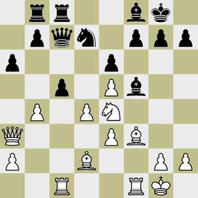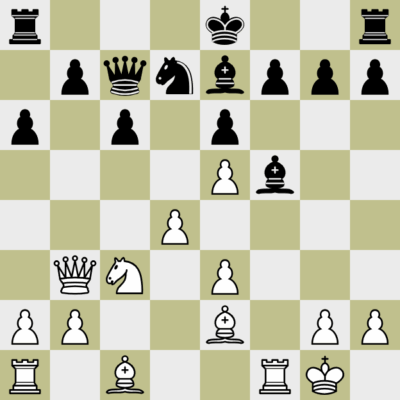 Hier überlegte ich über 20 Minuten an 11.g4!? , diese Zeit sollte mir am Ende fehlen. 11…Sxg4 12.e4 (Von 12.Sxf7 nahm ich instinktiv zurecht Abstand: 12…Kxf7 (12…Sxe3! 13.Lxe3 Kxf7 ist einfach ein Mehrbauer.) 13.e4 Dd8 (13…Kf6 mag man kaum spielen – 14.exf5 exf5 15.h3 Sh6) 14.exf5 Dh4+ Das hielt ich für schlecht für Weiß, eine fehlerhafte Einschätzung: 15.Kd1 Sf2+ 16.Kc2 Sxh1 17.Lxe6+ und Weiß schlägt nacheinander auf d7, b7 und a8.) und leider ist nach 12…Sgxe5 13.fxe5 Lg6 alles in Ordnung.