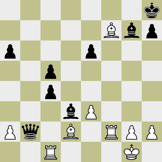 Und jetzt sehe ich es nicht! 34.Lxe6! ist mindestens Remis: 34…c3? Davor hatte ich Angst. (34…Da3 Die Dame muss von der Diagonalen runter. 35.Lxc4 Lb2 36.Tf8+ Kg7) 35.Tf8+! Lxf8 36.Lxc3+ Dxc3 37.Txc3 und Gewinn.