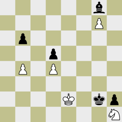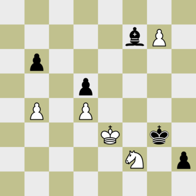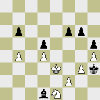 Anyway, Adrian und Micke hatten uns mit 3.5 zu 1.5 in Führung gebracht und die verbliebenen drei Bretter verteidigten schlechtere Endspiele. Olafs Turmendspiel war wohl aussichtlos, auf Axels Kenntnisse über ungleichfarbige Läuferendspiele durfte man vertrauen … und der Dritte war ich. In meiner Weißpartie gegen Bernhard Rutschke stand das klassische Damengambitendspiel Guter Springer gegen schlechter Läufer auf dem Brett, mit zwei kleinen Unterschieden. Ich bekam meinen Springer nicht nach c3 oder e3 und Schwarz konnte auf der h-Linie einen entfernten Freibauern bilden. Wir blenden uns in die entscheidende Phase ein.