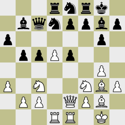 1.e4 g6 2.h3 d6 3.g4 Lg7 4.Lg2 Sf6 5.Sf3 c6 6.Sc3 Sbd7 7.d4 0-0 8.0-0 Dc7 9.d5 c5 10.Lf4 a6 11.e5 dxe5 12.Lg3 b5 13.Te1 Se8 14.a3 Lb7 15.De2 Td8 16.Tad1