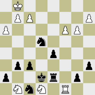 In der sechsten Runde saß ich am ersten Brett dem 13-jährigen Jakob Herrmann gegenüber, dem ich im Herbst in der Liga noch ein Remis hatte abringen können. Ein halbes Jahr später schaffte ich das nicht mehr. Die Partie war lange im Gleichgewicht, aber Jakob stellte immer neue Probleme und ließ nicht locker. An dieser Stelle war es schon verloren. Ich zeige die Stellung aus ästhetischen Gründen. Der Weiße schaffte es tatsächlich, alle drei Figuren auf meine Grundreihe zu bringen. Ich fühlte mich wie ein Eishockey-Torwart, der nicht mehr kontrollieren kann, was hinter seinem Tor passiert.