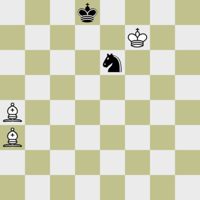 Diese seltene Figurenkonstellation hatte ich im letzten Jahr gegen IM William Paschall auf dem Brett. Weiß hatte gerade meinen letzten Bauern vom Brett entfernt und damit die 50-Züge-Regel in Gang gesetzt. Wir spielten Blitz mit 5+3 und zumindest ich lebte nur noch vom Inkrement. Ich erinnerte mich dunkel, dass das Endspiel verloren ist, aber der schwarze Plan war klar: den Springer nicht verlieren. Vielleicht ist es bei knapper Zeit sogar einfacher, die Stellung zu verteidigen als den Gewinn zu finden, jedenfalls schaffte es William nicht, seinen Vorteil zu realisieren. Gibt es hierzu eigentlich Endspieltheorie?