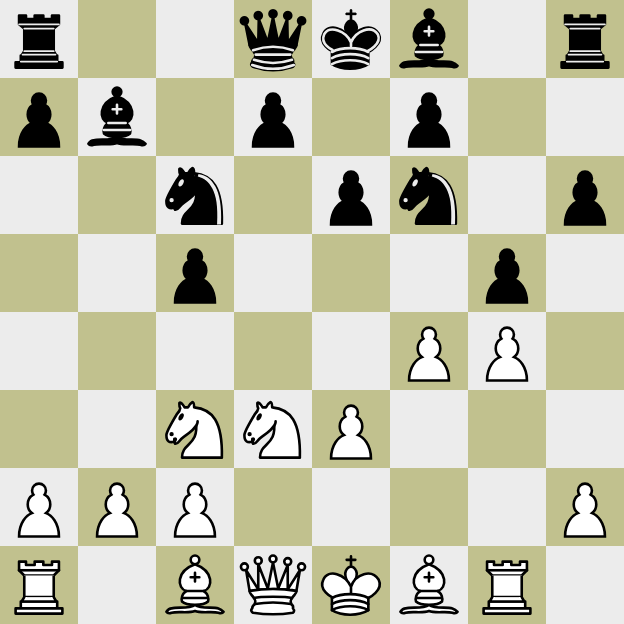10…d5 11.Lg2 c4 12.Sf2 Lc5 13.fxg5 hxg5 14.e4 Lxf2+ 15.Kxf2 Db6+ 16.Kf1 d4 17.Lxg5 Sh7 18.Sd5 exd5 19.exd5 Sxg5 20.dxc6 Lxc6 21.Lxc6+ Dxc6 22.Dxd4 Df3+ 23.Ke1 0-0