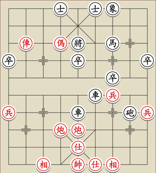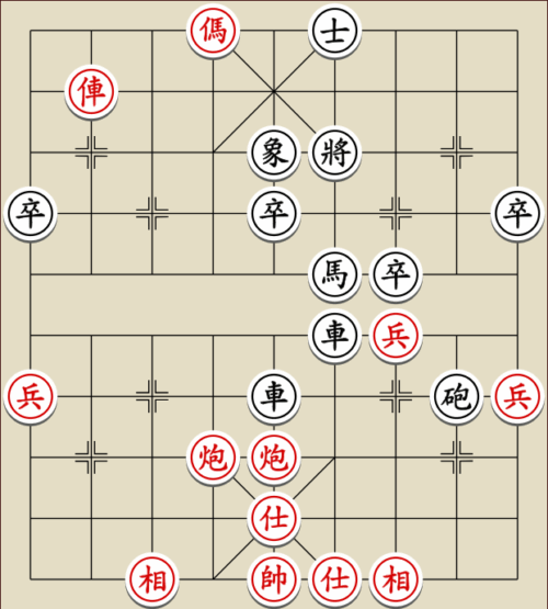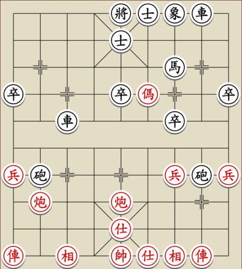 Schwarz wehrt das rote Vorhaben H4+3 passiv ab. Das Computerprogramm XieXie will stattdessen aktiv R3=6 spielen und das rote Pferd attackieren. Eine Folge könnte dann H4+3 R6-3 C8=7 K5=4 (R4=3 C7+6) R9=8 R6=7 C7+1 sein, mit der Rot für das Pferd eine schwarze Kanone bei anhaltend aktivem Spiel erhält.