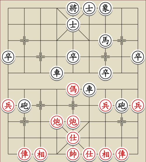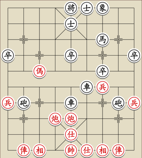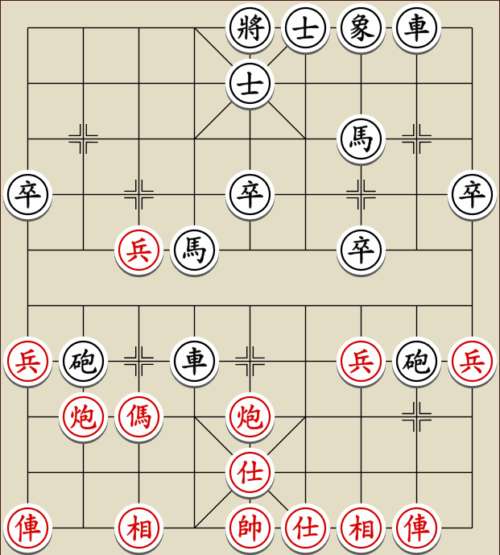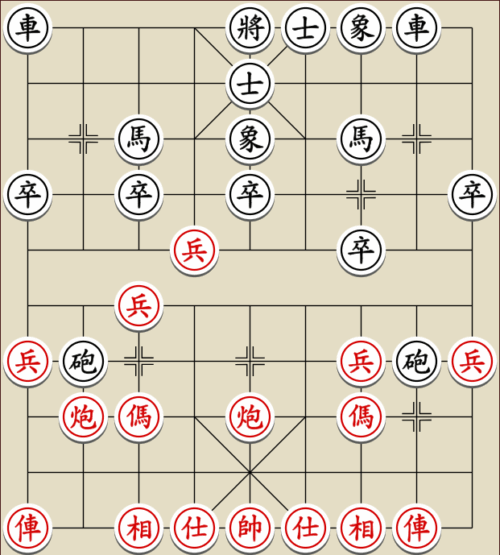 Bis hierher kommt auch mein Eröffnungsbuch. Wenn ich es richtig deute, heißt das Abspiel Mittelkanone und 7-Reihe-Soldat gegen Pferde-Schirm und beide Kanonen über den Fluss. Normalerweise verhindert Rot das Eindringen beider Kanonen durch das ruhige R2+4 (Flusswache) oder das aggressive R2+6. Stattdessen nutzt er die Zeit, um seinen Mittelsoldaten über den Fluss zu bekommen.