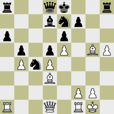 Magnus hatte gegen den schwarzen Franzosen das Flügelgambit ausgepackt und nach dem Bauernopfer am Damenflügel am Königsflügel noch einen Springer investiert. Mit 19…Sb2 wäre hier eine gute Gelegenheit gewesen, auch noch den Läufer auf d3 abzutauschen, aber egal.