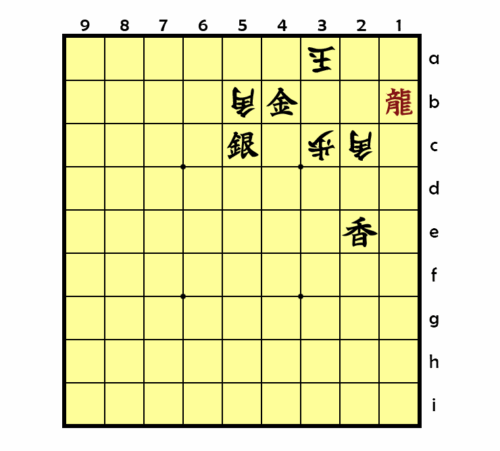 Tsume in 5 Halbzügen. Shogi ist durch die vielfältigen Figurenumwandlungen und das Wiedereinsetzen geschlagener Steine besonders schwer zu visualisieren. Das Lösen auf Aufgaben ist eine gute Übung. Diese hat mich bestimmt 15 Minuten gekostet. Aber die Lösung ist überraschend und ästhetisch befriedigend.