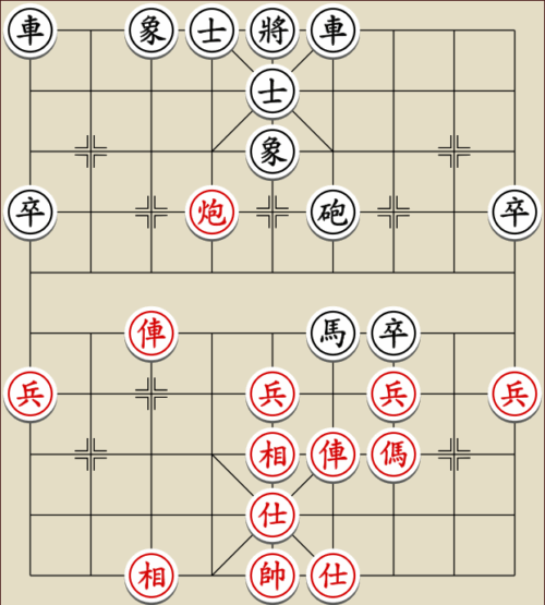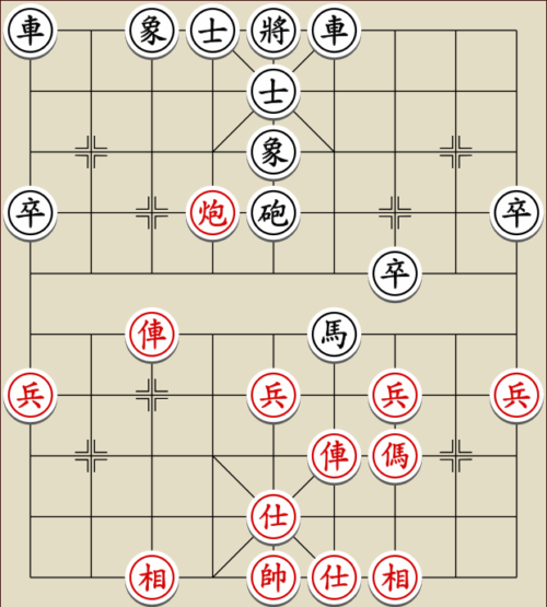 Es war nicht unbedingt zu erwarten, dass ich ausgerechnet gegen Pu Fangyao, den zur Zeit besten deutschen Xiangqispieler, die Gelegenheit bekommen würde, etwas für meinen Erwartungswert (0.5 aus 5) zu tun. Aber Fangyao war meinen nicht-vorhandenen Theoriekenntnissen ausgewichen, ich konnte mir irgendwie seinen Mittelsoldaten schnappen und nach 18 Zügen stand diese Stellung auf dem Brett (Kalhorn – Pu, Deutsche Meisterschaft, Hamburg, 27.10.2012).