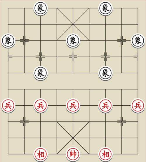 Tatsächlich nehmen die Elefanten wichtige Aufgaben wahr. Im Diagramm zeigen die schwarzen Elefanten die sieben Punkte, die von ihnen betreten werden können. Wendet man den Blick auf die rote Hälfte, stellt man schnell fest, dass insbesondere der Punkt zwei Schritte vor dem roten Feldherrn (der „Palastausgang“) von erheblicher Bedeutung ist. Wie wir später sehen werden, werden auf der Mittellinie oft Angriffe gegen den Feldherren ausgeführt. Ein Elefant auf dem Palastausgang bietet dagegen (oft zusammen mit einem Leibwächter dahinter) Schutz, zumal sich beide Elefanten dann gegenseitig verteidigen können. Dieser Zug des Elefanten ist denn auch ein beliebter Verteidigungszug. Zudem überwacht der Elefant von diesem Feld aus zwei Punkte am Flussufer und unterstützt dadurch den Vormarsch des zweiten und vierten Soldaten. Der Elefant ist eine ungewöhnliche Figur für den westlichen Schachspieler – ich übersehe oft seine Schlagzüge.