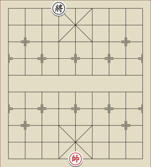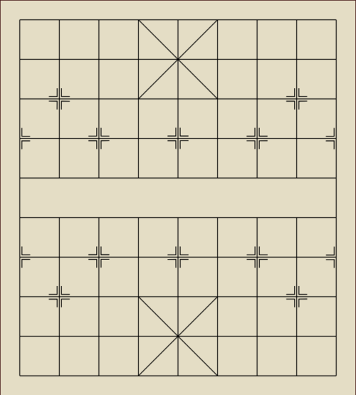 Im Xiangqi wird wie beim Go nicht auf den Feldern, sondern auf den Schnittpunkten des Brettes gespielt. Das Brett hat neun Linien und zehn Reihen. Es ist durch den Gelben Fluss zweigeteilt. Auf der unteren Hälfte, die den Norden des chinesischen Reiches symbolisiert, befindet sich das rote Heer, die schwarzen Steine befinden sich in der Grundstellung auf der anderen Seite, dem Süden. Der Fluss beschränkt die Zugmöglichkeiten der Elefanten, die den Fluss nicht überqueren dürfen. Die Zugmöglichkeiten der Soldaten vergrößern sich dagegen, sobald sie den Fluss überquert haben. Die Punkte am Ende der eingezeichneten Diagonalen begrenzen den roten und den schwarzen Palast. Der Feldherr und die Leibwächter dürfen den Palast nicht verlassen. Die markierten Punkte innerhalb des Spielfeldes zeigen die Ausgangsposition der Soldaten und Kanonen.