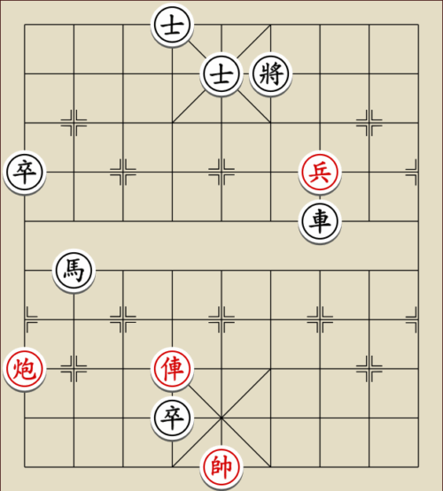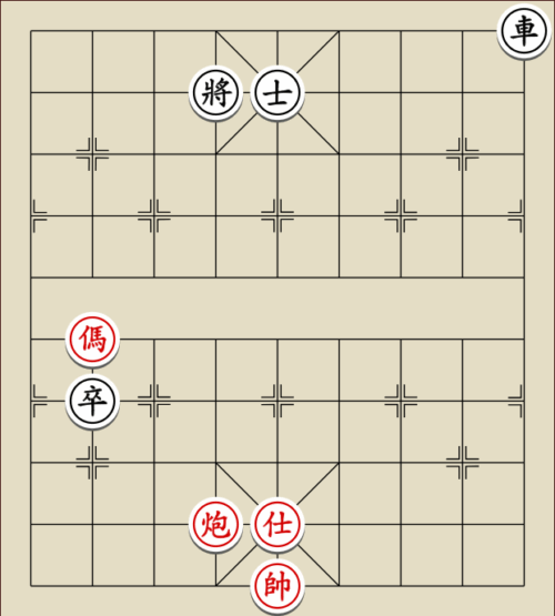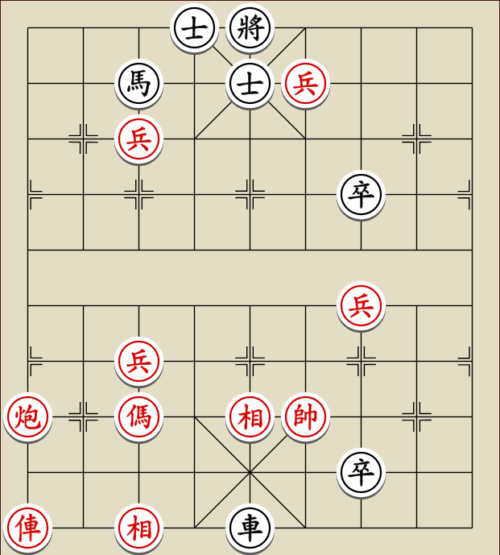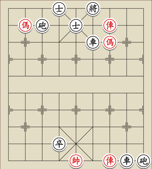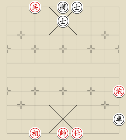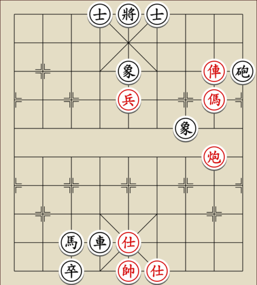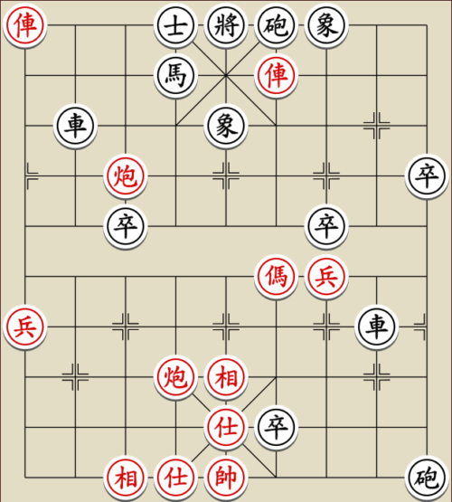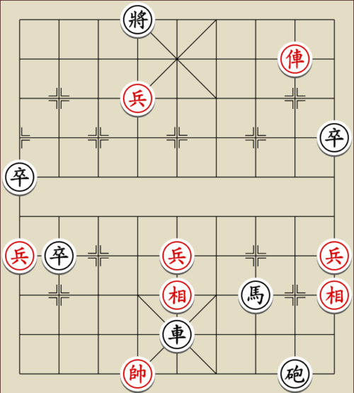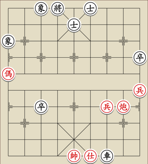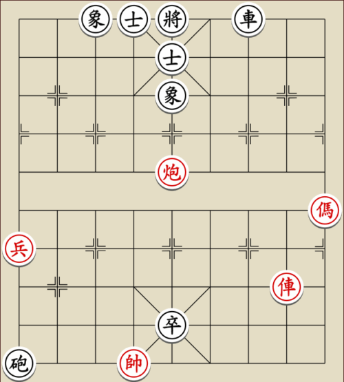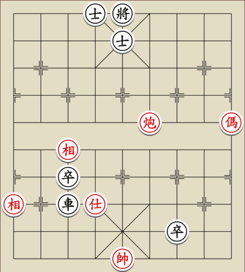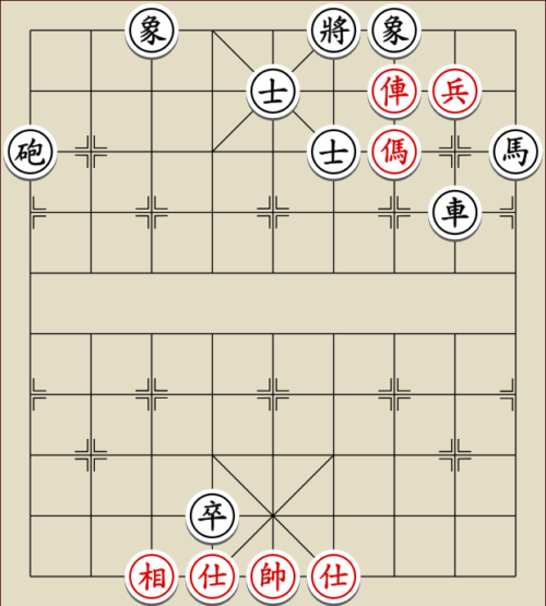 (23) 1.C9+7+ H3-1 2.E7+9 R5=1 3.E5-7 Wagen und Pferd sind festgelegt. Rot gewinnt mit drei Soldaten gegen zwei Leibwächter.