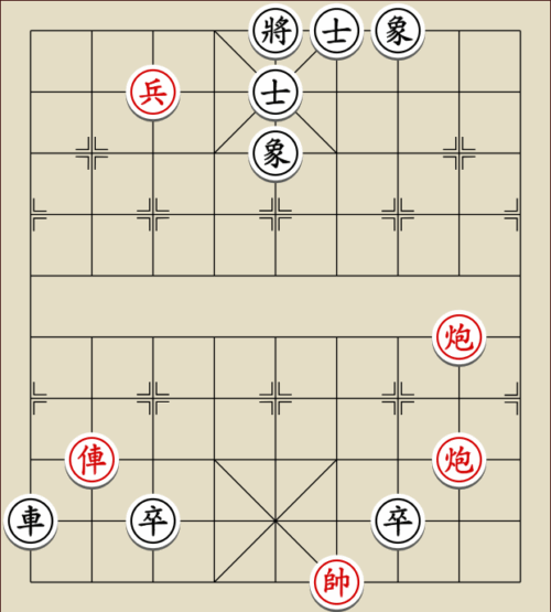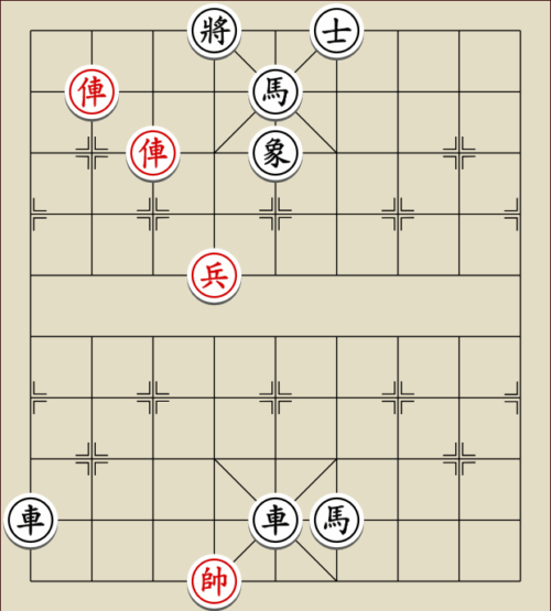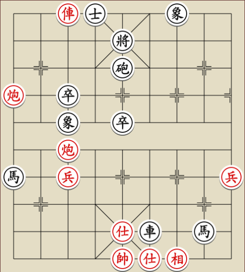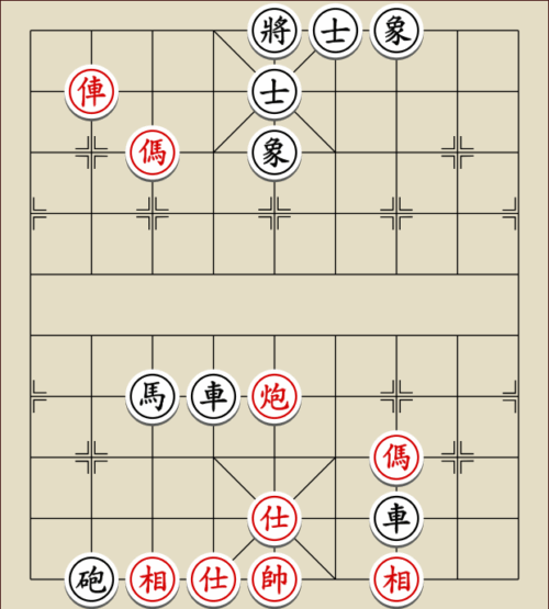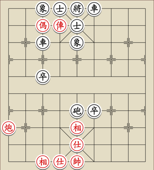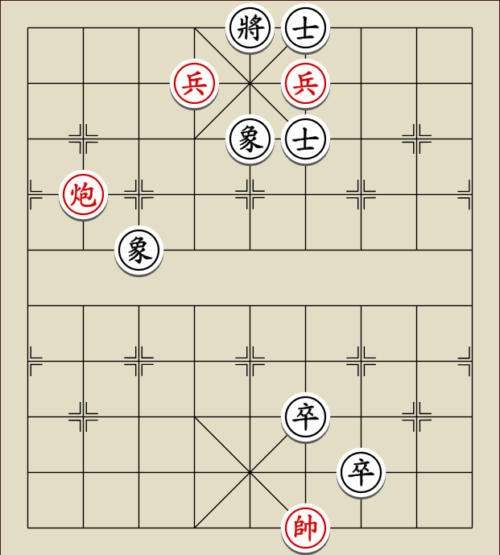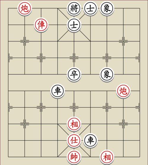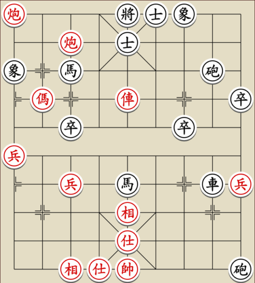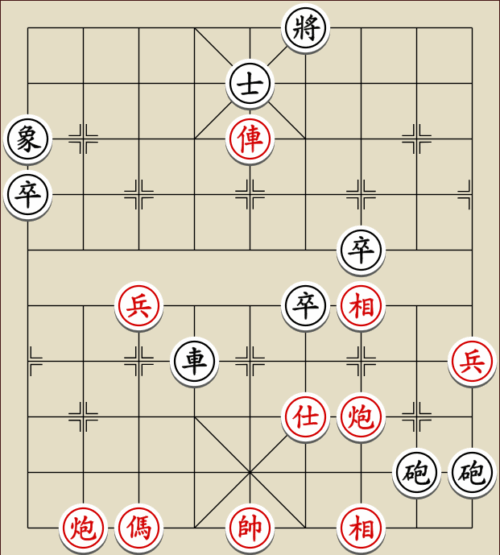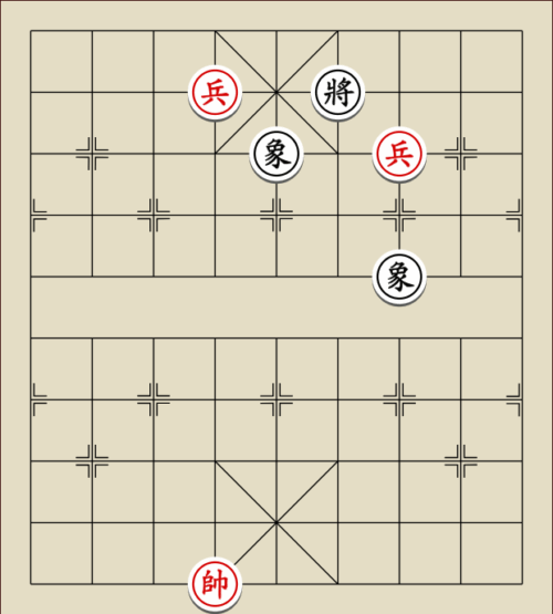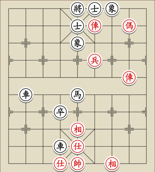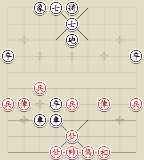 (23) 1.C9+7+ H3-1 2.E7+9 R5=1 3.E5-7 Wagen und Pferd sind festgelegt. Rot gewinnt mit drei Soldaten gegen zwei Leibwächter.